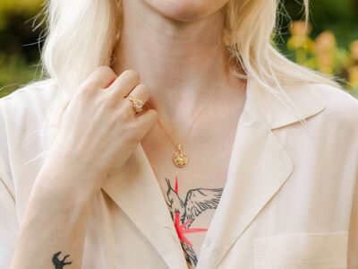 Ring and necklace by jewelry designer Diana Leon, who has bought her new Forest Goddess collection and additional pieces to a residency at the Luxury Exchange
